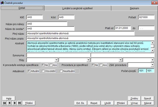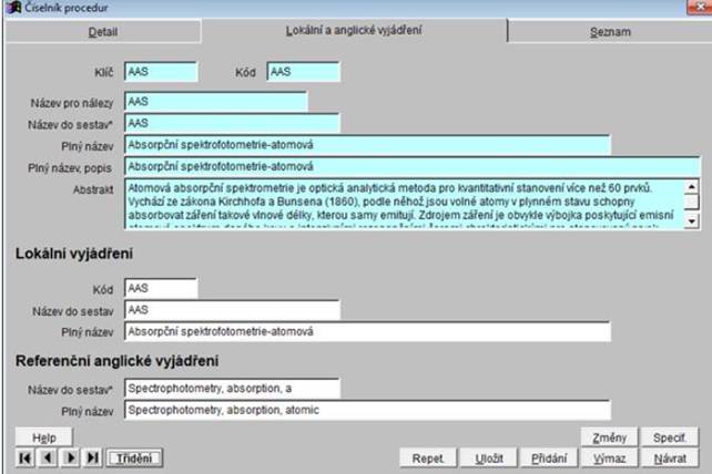 Dialog má tři záložky - Detail, Lokální a anglické vyjádření a Seznam. Záložka Detail obsahuje základní informace o aktuální proceduře. Záložka Lokální a anglické vyjádření obsahuje údaje o aktuální proceduře, které můžete měnit. Záložka Seznam zobrazí seznam všech procedur.