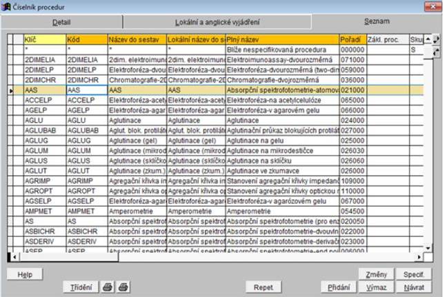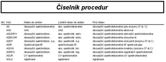 Záložka "Seznam" zobrazuje seznam všech procedur. V záložce "Seznam" nelze žádné údaje opravovat