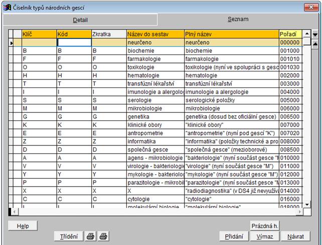 Kliknutím na hlavičku sloupce lze seznam setřídit podle kódu.
