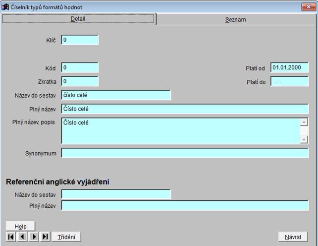 Dialog pro práci s jednoduchými číselníky SLP má dvě záložky - Detail a Seznam. Záložka Detail obsahuje základní informace o aktuálním záznamu jednoduchého číselníku. Záložka Seznam zobrazí seznam všech záznamů jednoduchého číselníku.
