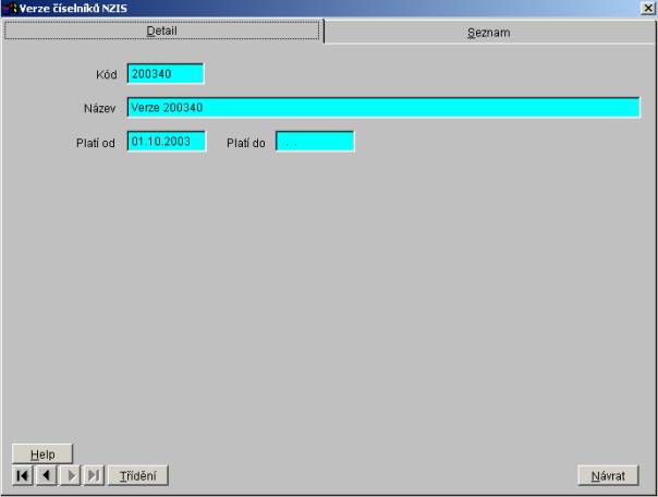 Dialog pro práci s číselníkem verzí číselníků NZIS má dvě záložky - Detail a Seznam. Záložka Detail obsahuje základní informace o aktuálním záznamu číselníku verzí číselníků NZIS. Záložka Seznam zobrazí seznam všech záznamů číselníku verzí číselníků NZIS.