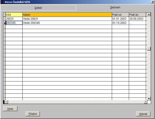 Ve sloupcích seznamu jsou zobrazeny údaje z číselníku verzí číselníků NZIS (obecné informace o práci se záložkou Seznam - viz Dialogy programu SLP).