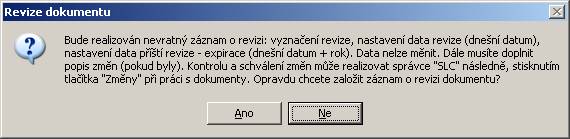 Po odpovědi "Ano" bude nastavena závažnost změny na hodnotu "beze změny", stručný popis na "Revize" a podrobný popis na "Revize dokumentu". Zároveň bude nastaveno datum příští revize na datum změny (revize) + 1 rok. Po odpovědi "Ne" bude příznak provedení revize "odnastaven" (vrácen zpět na hodnotu "není pravda").