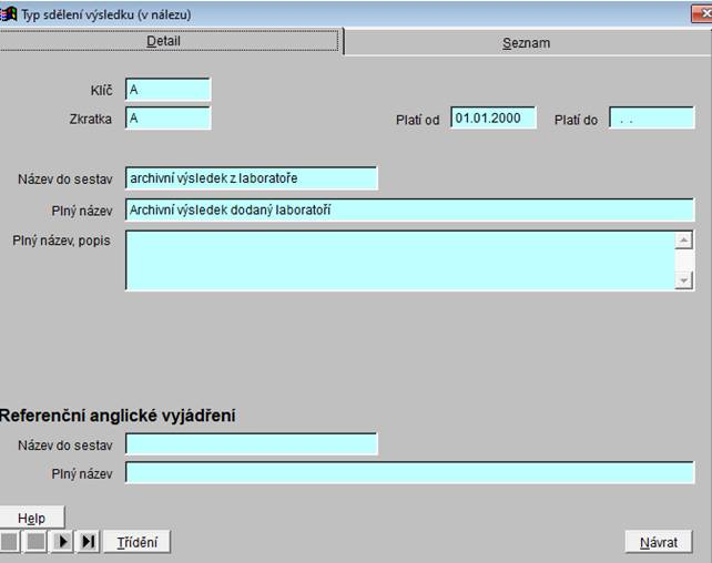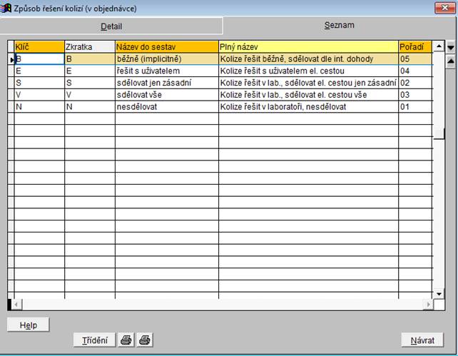 Popis tlačítek Help, Třídění a Návrat - viz Popis záložky Detail.