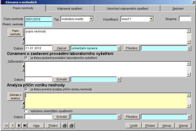 Schválil - tlačítko pro výběr pracovníka laboratoře, který schválil, že je třeba provést analýzu příčin vzniku neshody. Schválení se týká i případného vyřešení neshody okamžitým opatřením. Vybírá se ze seznamu pracovníků laboratoře.