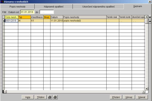 Popis tlačítek Help, Třídění, Přidání a Výmaz - viz Popis záložky Popis neshody.