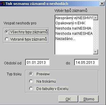 Dále lze zadat období, ve kterém musí být datum založení popisu neshody (záložka "Popis neshody"). Tiskovou sestavu lze zobrazit na monitoru (volba Preview), nebo vytisknout (volba Na tiskárnu). Je orientována na šířku. Sestava bude tříděna sestupně dle čísla neshody. Další možností je seznam neshod uložit do excelové tabulky a z té si pak následně vytvořit tiskovou sestavu podle vašich požadavků (volba typu tisku "Do tabulky v Excelu).