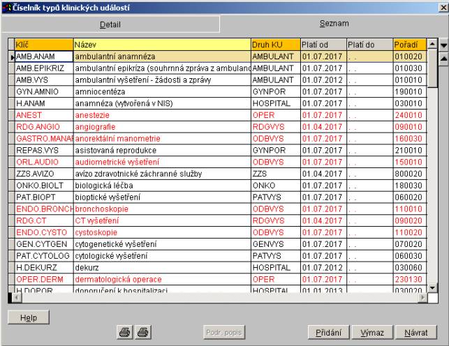 Ve sloupcích seznamu jsou zobrazeny údaje z číselníku typů klinických událostí (obecné informace o práci se záložkou Seznam - viz Dialogy programu SLP).