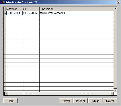 Dialog pro práci s historií autorů, kteří používali aktuální kód autora. Údaje v opravovat pouze správce nastavení (**). Všem ostatním slouží údaje pouze ke čtení (nemají zobrazena tlačítka Oprava, Přidání, Výmaz).