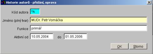 Přidání - přidání nového autora do historie pro aktuální kód autora. Objeví se stejný dialog jako pro tlačítko Oprava. Po vyplnění údajů a stisknutí tlačítka "OK" bude nový záznam přidán.