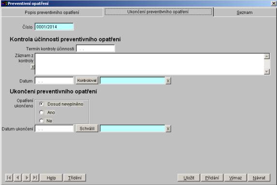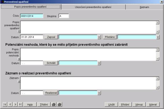 Popis tlačítek pohybová tlačítka, Help, Třídění, Uložit, Přidání, Výmaz a Návrat - viz popis záložky Popis preventivního opatření.
