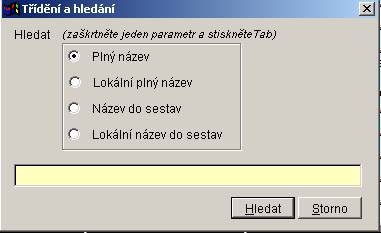 Po stisknutĂ tlaÄŤĂtka "Hledat" bude pĹ™epnuto tĹ™ĂdÄ›nĂ seznamu komponent dle vašà volby. Pokud byl vyplnÄ›n hledanĂ˝ Ĺ™etÄ›zec, bude nalezen prvnĂ záznam, kterĂ˝ odpovĂdá hledanĂ©mu Ĺ™etÄ›zci a dialog TĹ™ĂdÄ›nĂ a hledánĂ bude ukonÄŤen. Nebyl-li žádnĂ˝ takovĂ˝ záznam nalezen, objevĂ se hláška "Nenalezeno" a dialog pro TĹ™ĂdÄ›nĂ a hledánĂ nebude ukonÄŤen. Lze zmÄ›nit hledanĂ˝ Ĺ™etÄ›zec a hledánĂ opakovat, nebo tlaÄŤĂtkem Storno dialog ukonÄŤit.