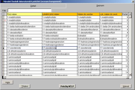AlternativnĂ tvar NÄŚLP vycházĂ z ÄŤĂselnĂku komponent. V nÄ›m je moĹľnĂ© hledat i filtrovat podle všech vatriant lokálnĂch názvĹŻ a synonym. Po nalezenĂ komponenty mĹŻĹľete zobrazit národnĂ poloĹľky definovanĂ© pro tuto komponentu a následnÄ› nastavit, kterĂ© lokálnĂ poloĹľky zpracováváte ve vašà laboratoĹ™i.