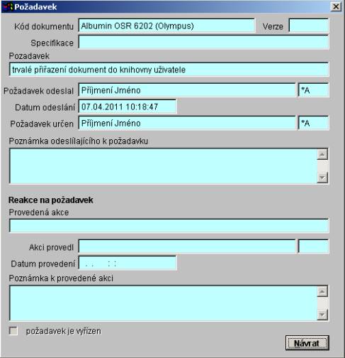 Požadavek - tlačítko na zobrazení detailních informací o požadavku na trvalé přiřazení dokumentu do knihovny uživatele SLP