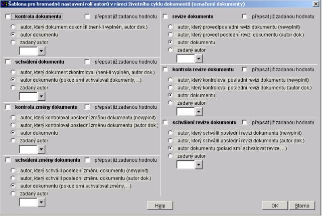 • autor dokumentu (pokud smí schvalovat revize, ...) - pokud smí schvalovat revize dokumentu, přenese se do role "Revizi dokumentu schválí" autor dokumentu. V opačném případě se do role "Revizi dokumentu schválí" přenese autor zadaný v poli pod možností "zadaný autor"