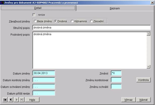 Změnu kontroloval - kód autora, který provedl kontrolu změny. Lze buď zadat "ručně", nebo pomocí tlačítka "Kontrola".