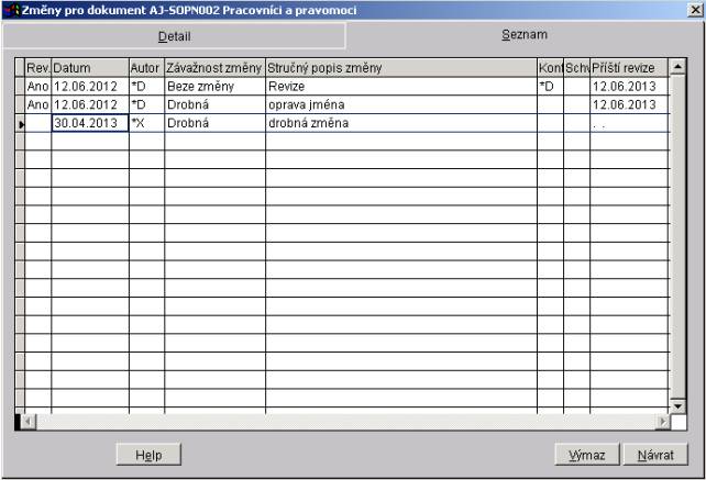 Záložka Seznam zobrazuje seznam všech změn, které se váží k aktuálnímu dokumentu. V záložce "Seznam" nelze žádné údaje opravovat.