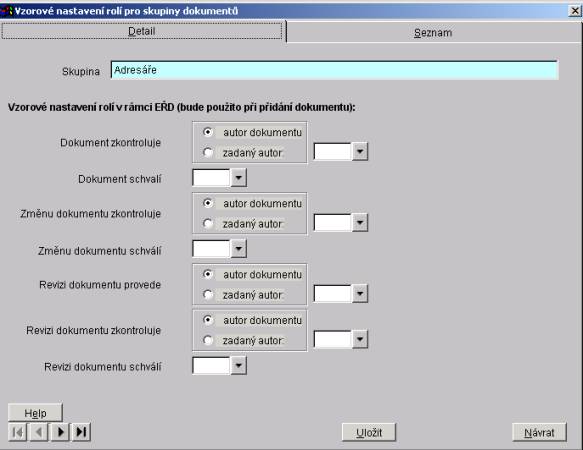 U rolí "dokument zkontroluje", "změnu dokumentu zkontroluje", "revizi dokumentu provede", "revizi dokumentu zkontroluje" lze vybrat, zda akci provede autor dokumentu nebo zadaný autor. U ostatních rolí (dokument schválí, změnu dokumentu schválí, revizi dokumentu schválí) lze pouze zadat autora.