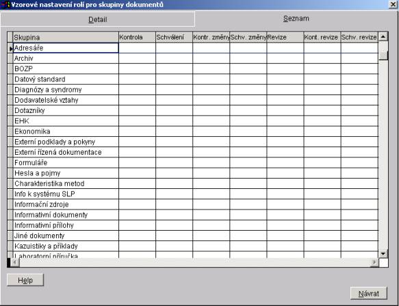 V seznamu je zobrazen seznam skupin dokumentů a ke každé skupině vzorové nastavení rolí.