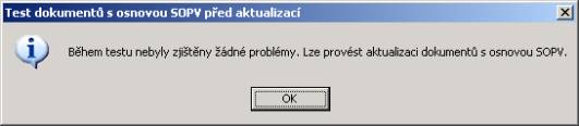 Test - tlačítko Test zkontroluje všechny vaše dokumenty s osnovou SOPV (s výjimkou neaktuálních a archivovaných) a otestuje v nich, zda lze provést automatické přejmenování měněných bodů osnovy SOPV. Pokud není během testu zjištěn žádný problém, objeví se po skončení testu hláška: