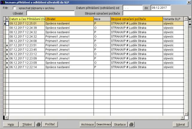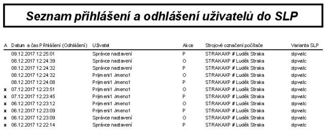 Seznam přihlášení a odhlášení uživatelů do SLP