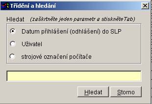 Práce se žurnálem přihlášení a odhlášení uživatelů do SLP. Volba je dostupná pro všechny uživatele s právy SLC nebo SLD a pro správce nastavení (**). To, zda se bude žurnál vytvářet, lze nastavit v počátečním nastavení systému, záložce "Ostatní".