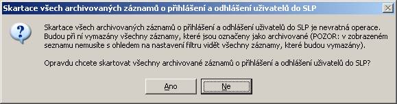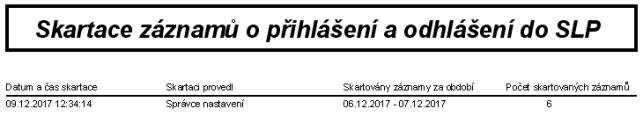 Při skartaci budou ze žurnálu trvale odstraněny všechny záznamy označené archivačním příznakem. O proběhlé skartaci bude vytvořen záznam (obsahuje datum skartace, kdo skartaci provedl, kolik bylo skartovaných záznamů a z jakého období záznamy byly.