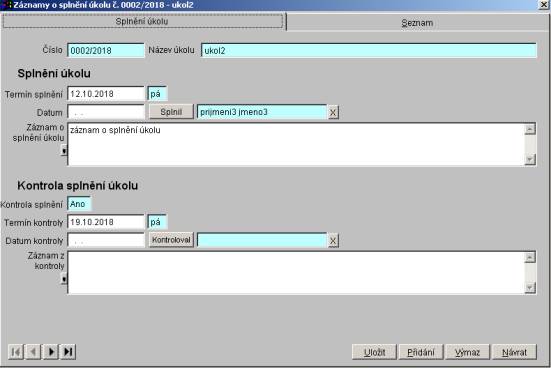 záznamy o plnění aktuálního úkolu má dvě záložky - Splnění úkolu a Seznam.