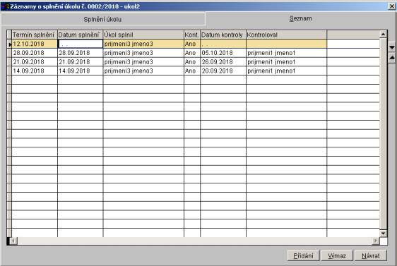 Záložka Seznam zobrazuje seznam všech splnění úkolu. V záložce "Seznam" nelze žádné údaje opravovat
