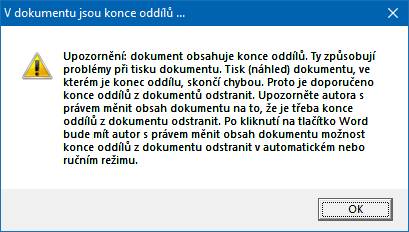 Pokud Word spouští uživatel, který nemá právo dokument editovat, objeví se mu upozornění, že dokument obsahuje konce oddílů, nelze ho vytisknout (vytvořit náhled dokumentu):