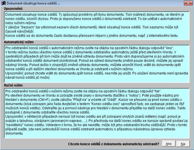 Na spodku obrazovky je dotaz na automatické odstranění konců oddílů z dokumentu.