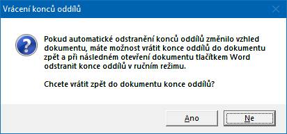 Po odpovědi "Ano" dojde před spuštěním Wordu k odstranění všech konců oddílů z dokumentu. Protože v ojedinělých případech může po automatickém odstranění konců oddílů dojít ke změně vzhledu dokumentu, je doporučeno vzhled dokumentu zkontrolovat. Pokud se vzhled dokumentu změnil pouze drobně, lze jej upravit nástroji Wordu. Pokud došlo k výraznější změně vzhledu dokumentu, je doporučeno ukončit Word bez uložení dokumentu, vrátit do dokumentu zpět konce oddílů a při dalším otevření dokumentu ve Wordu je odstranit v ručním režimu. Proto se po ukončení Wordu objeví dotaz, pomocí kterého můžete konce oddílů do dokumentu vrátit a při příštím spuštění Wordu je odstranit v ručním režimu: